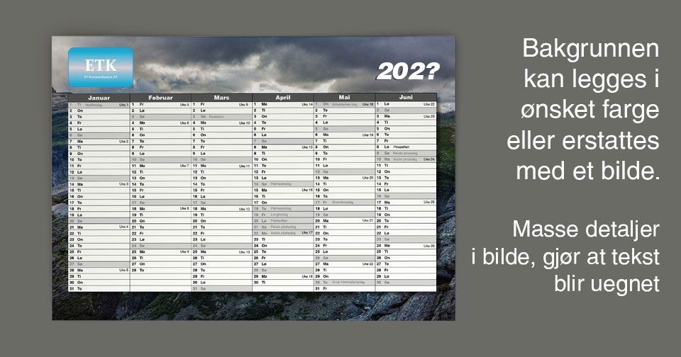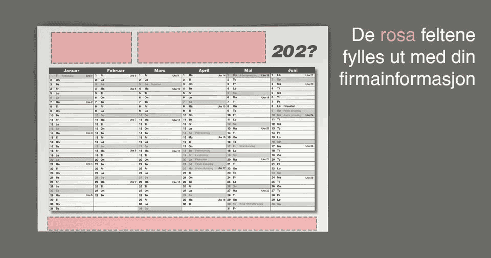 Vi tilbyr gratis oppsett av din kalender, så lenge du ikke har tilleggsønsker som går utover det som er beskrevet. Har du f.eks. en logo kun i bildeformat uten gjennomsiktig bakgrunn kan det medføre mer jobb. D.v.s. hvis logo skal ligge på en bakgrunn/bilde.